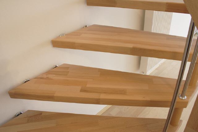 Bolzentreppe: Fix verbunden über Bolzen bzw. die Stufen direkt zur Wand oder über eine Wange mit Abstand dazwischen.