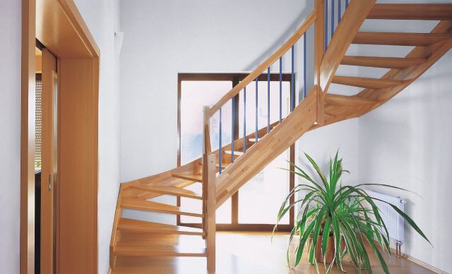 Economy 1/2 gewendelte Stiege in Buche fix, mit Wangen, Stufenbrett und steigendes Geländer (Innenseitig)