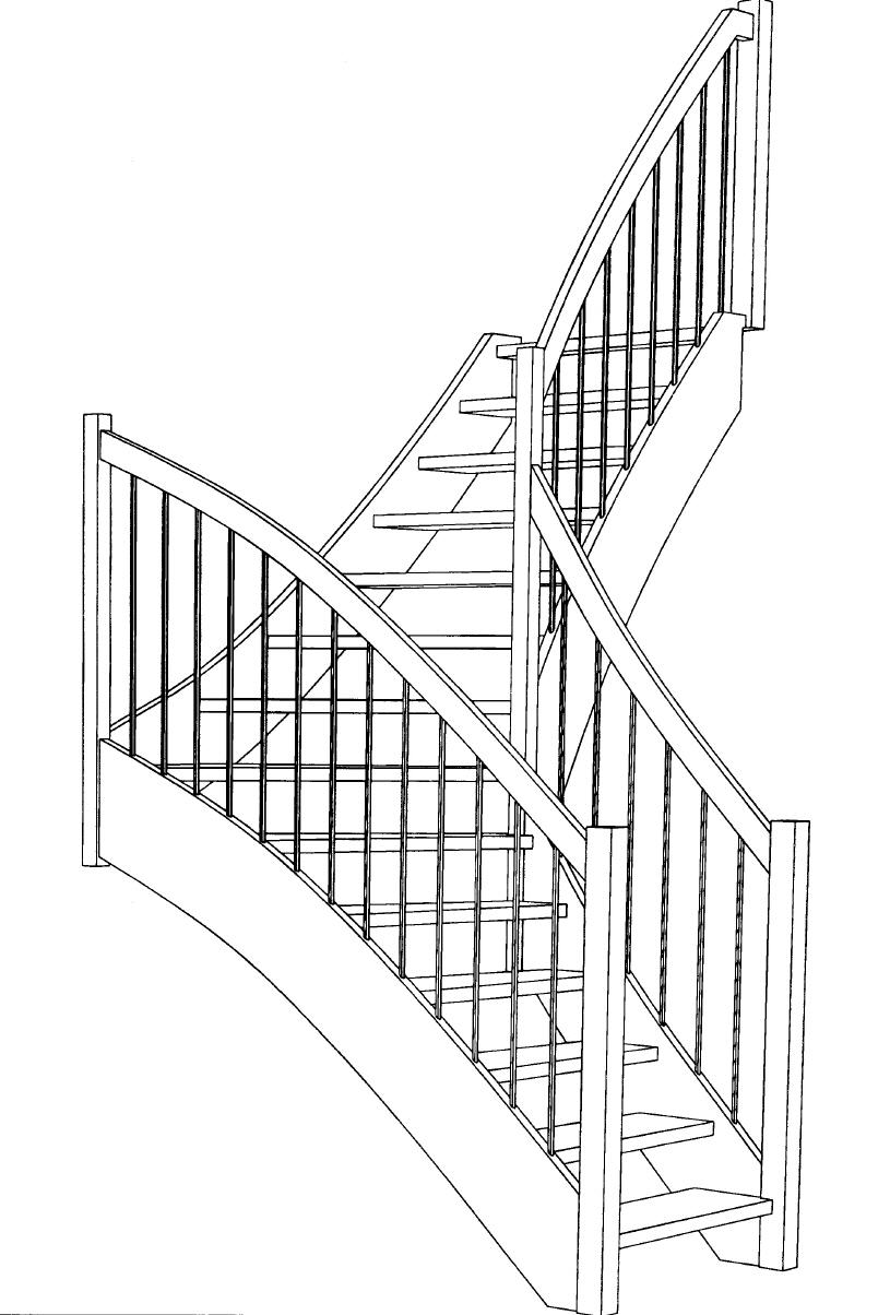 Eingestemmte Stiege, 1/4 gewendelt mit Wangen, Stufenbrett und steigendes Geländer (Innenseitig) Stufen Wangen 40 mm 15 Steigungen Ohne Setzstufen und Kinderleisten Geländer einseitig von der Inne...