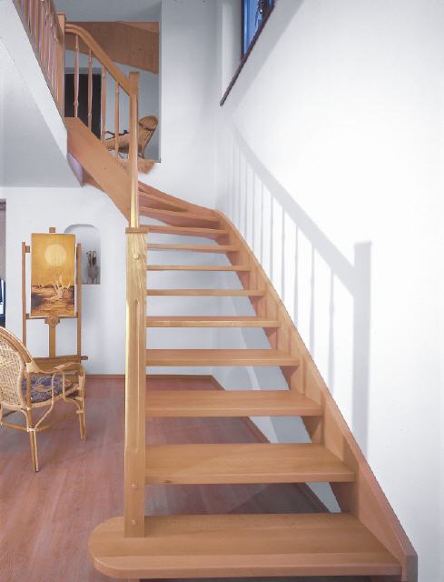 Eingestemmte Stiege in Buche bunt, mit Wangen, 1/4 gewendelt Stufenbrett und steigendes Geländer (Innenseitig) Stufen Wangen 40 mm 15 Steigungen Ohne Setzstufen und Kinderleisten Geländer einseit...