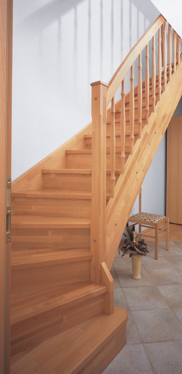 Eingestemmte Stiege in Buche fix, 1/4 gewendelt mit Wangen, Stufenbrett und steigendes Geländer (Innenseitig) Stufen Wangen 40 mm 15 Steigungen Ohne Setzstufen und Kinderleisten Geländer einseiti...