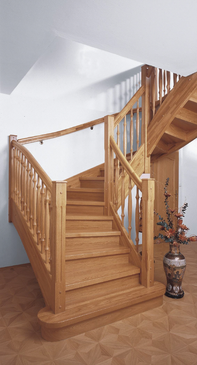 Eingestemmte Stiege, mit Wangen, Stufenbrett und steigendes Geländer (Innenseitig) Stufen Wangen 40 mm 15 Steigungen Ohne Setzstufen und Kinderleisten Geländer einseitig von der Innenseite Stufen und Wangen gerundet Handlauf 80 / 40 (M1) Stäbe rund 25 mm ( S1) Pfosten 80 x 80 glatt ( 1 A) Oberflächenbehandlung Wasserlack UV oder Lösemittel Lack bei geraden und gewendelten Treppen - Treppenpreis plus Aufpreis Podest gerechent Ohne Montage Breite bis 1000mm